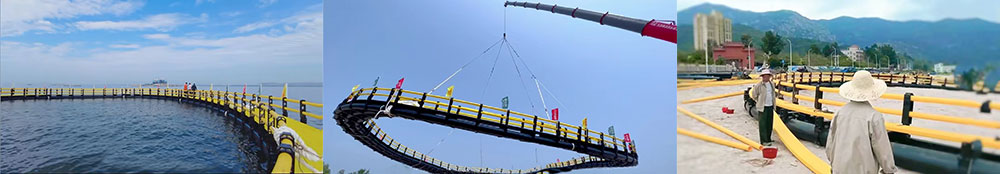 Installed cages can be either pushed into the water using excavators or lifted by cranes. With the aid of workboats and towing ropes, the cages are then towed to their designated locations, anchored securely,marking the completion ofthe cage framework system.